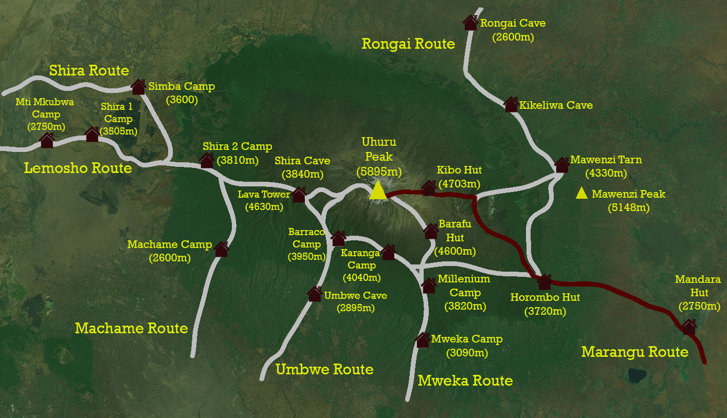 Marangu route adventures start at Marangu Gate, which sits at 8860 f (2700 m). This route is the most popular on Kilimanjaro, and can sometimes be busy with many climbers.